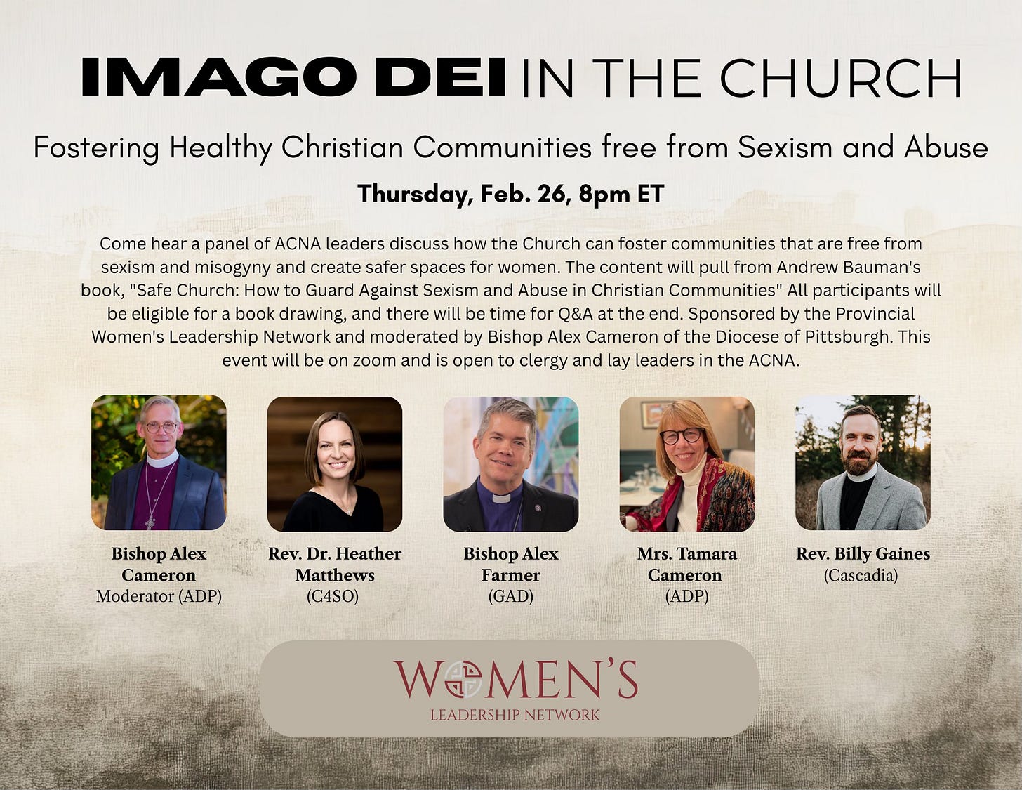 On February 26th is scheduled in ACNA (the Anglican Church in North America) a zoom forum, “Imago Dei in the Church: Fostering Healthy Christian Communities Free from Sexism and Abuse”. Promoted by the ACNA provincial office, it is “sponsored by the Provincial Women’s Leadership Network and moderated by Bishop Alex Cameron of the Diocese of Pittsburgh.” It features Bauman’s Safe Church. Alex Farmer is another ACNA bishop on the panel.